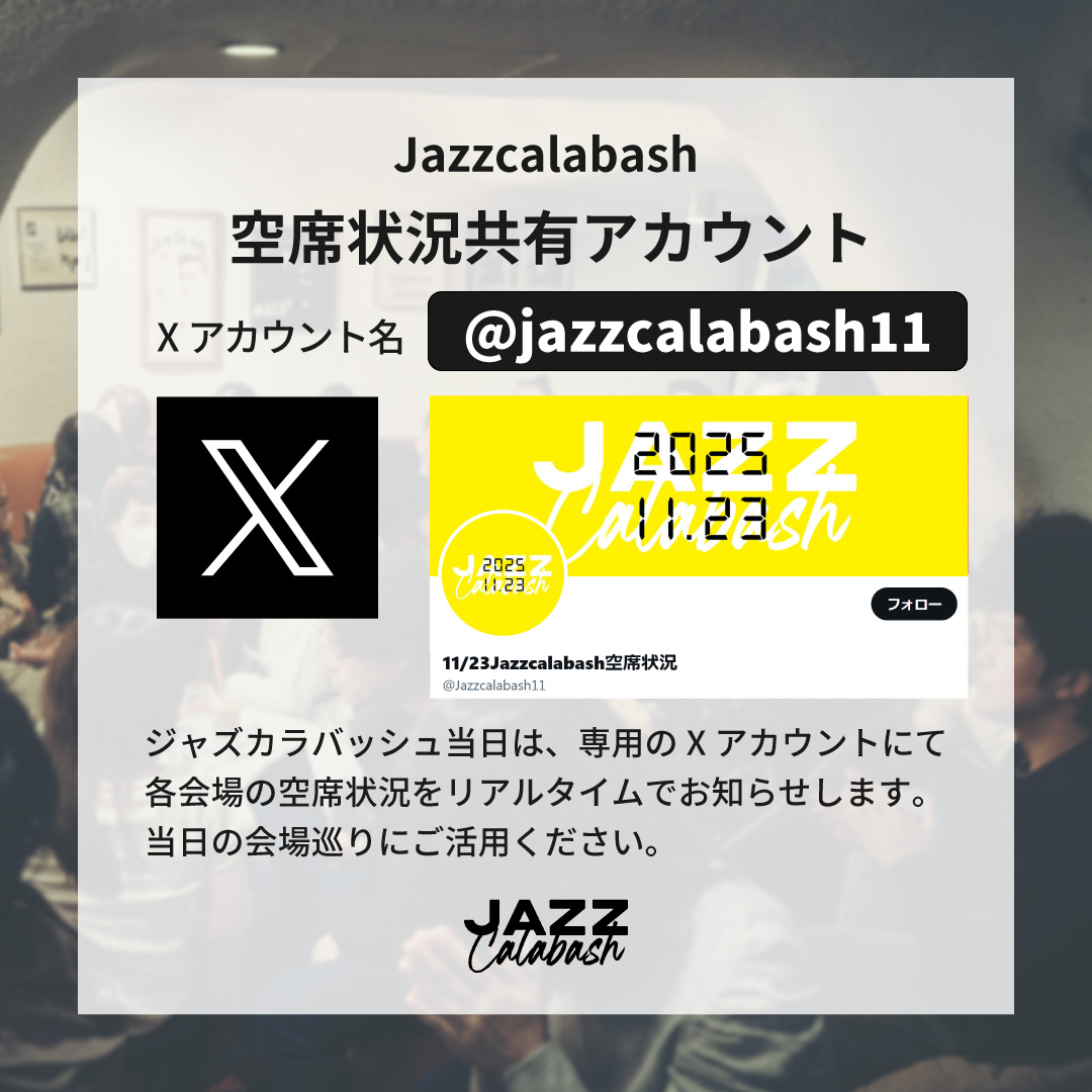 投稿日: 2025年11月21日2025年11月21日 投稿者: jazzcalabash空席状況共有アカウントのお知らせ 11月23日のジャズカラバッシュ当日は、専用のXアカウントにて各会場の空席状況をリアルタイムでお知らせします。 会場めぐりの参考に、ぜひご利用ください。 🔍 Xで「jazzcalabash11」と検索 ※当日のチケットは完売しております。
